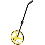 Designed to handle a variety of measuring jobs indoor and out. Durable neoprene tire for good traction over most surfaces. Push-button reset counter records feet and inches up to 10,000′. Counter subtracts as well as adds. Wheel circumference is 36". Diameter is 12-1/2". Folding heavy-duty handle with curved gripping area extends and locks at 39". Heavy-duty die-cast aluminum wheels and kickstand.